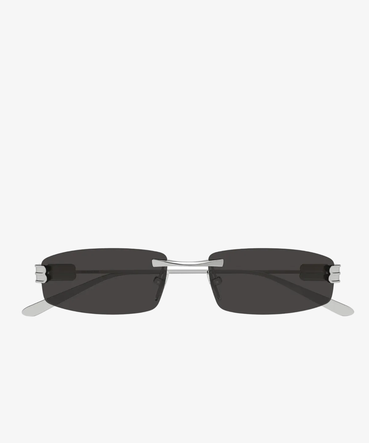 Balenciaga sunglasses for men, featuring shiny light ruthenium rectangular metal frame and solid grey bio nylon lenses. Made in Japan.