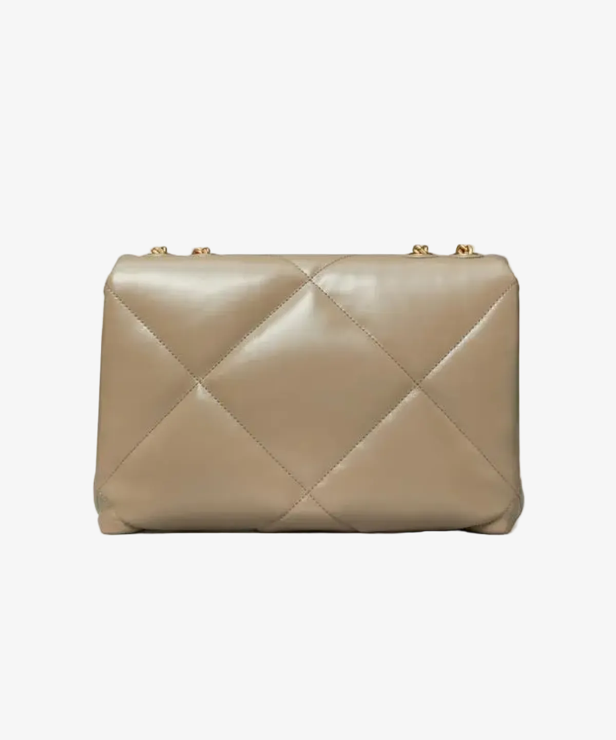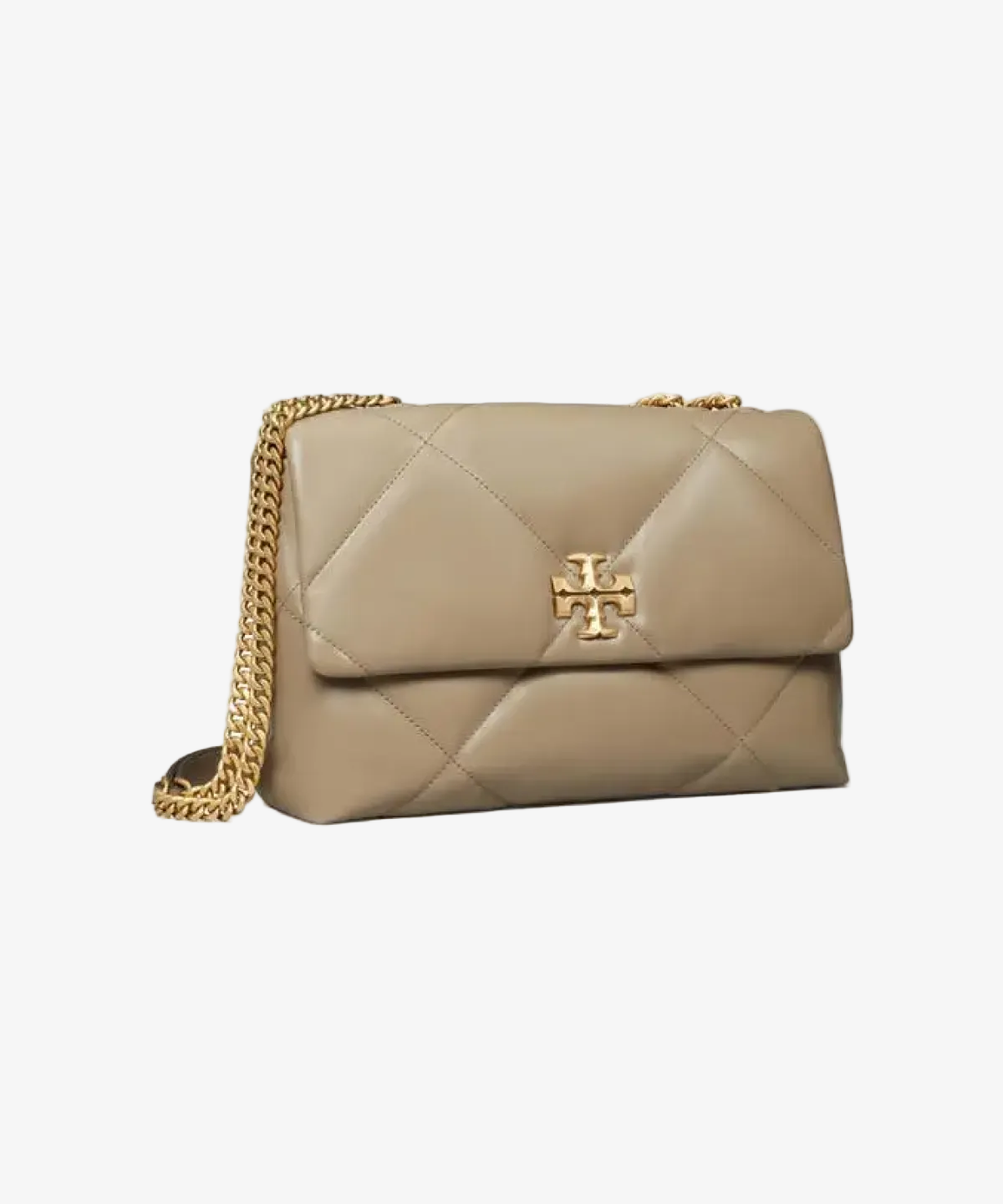 The Tory Burch Kira shoulder bag is crafted from diamond-quilted nappa leather and features polished gold-tone hardware. The convertible design features a flap with a magnetic closure, a pull-through chain strap, and a partitioned interior with zip and wall pockets. With a structured silhouette and flat base, it can be carried as a shoulder or crossbody bag.